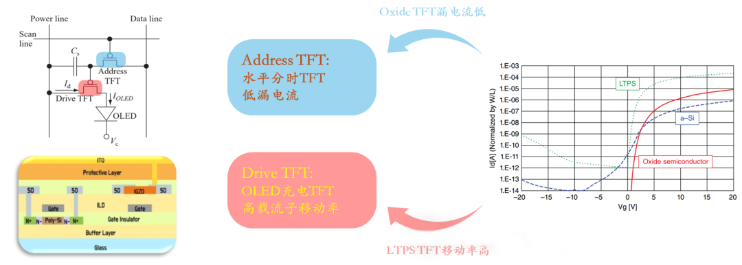 2018 मा एप्पलले LTPO टेक्नोलोजीको परिचयले LTPS र IGZO TFTs लाई एकीकृत गरी स्क्रिनको पावर खपतलाई उल्लेखनीय रूपमा घटाएर गतिशील रिफ्रेस दर समायोजनलाई सक्षम पार्दै दुवैका फाइदाहरूलाई जोड्यो। यो पछि देखि उच्च-अन्त AMOLED डिस्प्लेहरूको लागि एक हस्ताक्षर प्रविधि भएको छ।