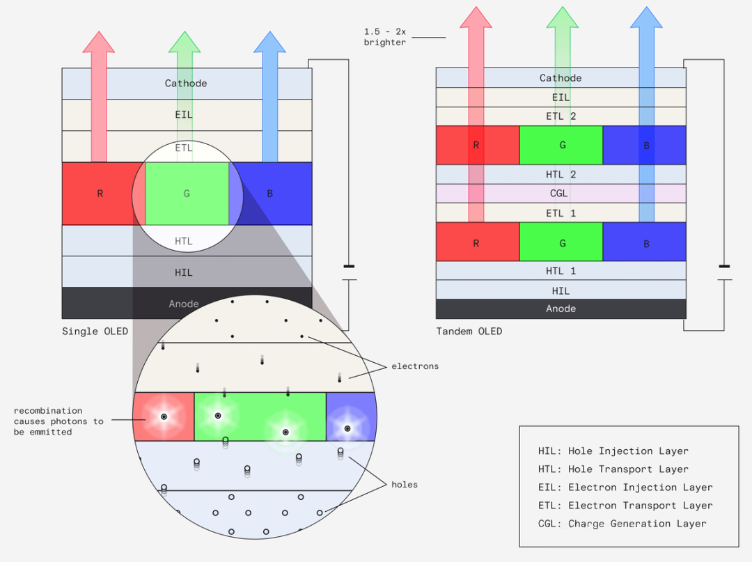 थप रूपमा, बहु-तह ट्यान्डम संरचनाले चार्ज जेनरेशन लेयर (CGL) मार्फत धेरै प्रकाश उत्सर्जन गर्ने एकाइहरू स्ट्याक गर्दछ, उपकरणको आयु विस्तार गर्दा चमक बढाउँछ। यी प्रविधिहरूले WOLED र QD-OLED जस्ता मुख्यधारा जन-उत्पादन समाधानहरूको लागि थप नेतृत्व गरेको छ।