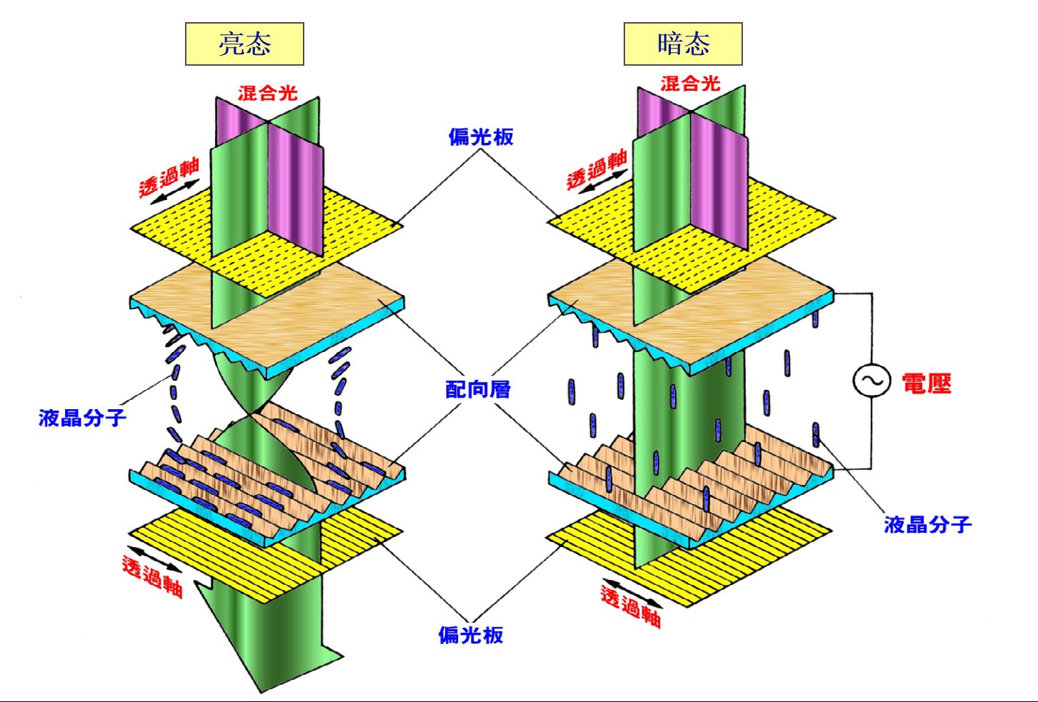 उज्यालो अवस्थामा (नन-डिस्प्ले स्टेट), तरल क्रिस्टल अणुहरूले नियमित 90-डिग्री ट्विस्ट गरिएको व्यवस्था कायम राख्छन्। अगाडि पोलाराइजरको ट्रान्समिशन एक्सिसबाट गुजरेपछि घटना प्रकाश ध्रुवीकृत हुन्छ। जब यो ध्रुवीकृत प्रकाश तरल क्रिस्टल तहबाट गुज्रन्छ, यसको ध्रुवीकरण दिशा आणविक ट्विस्ट संरचनाको साथ 90 डिग्री घुम्छ, पछाडिको ध्रुवीकरणको अप्टिकल अक्षसँग पङ्क्तिबद्ध हुन्छ र उज्यालो अवस्थाको रूपमा प्रसारण हुन्छ।